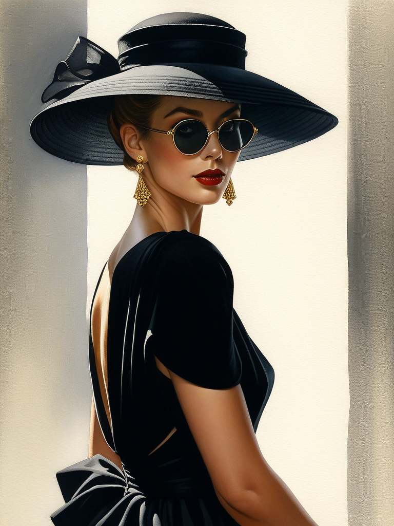 <lora:04Vintageillustration_Hap_XL:3.3>,Norman Rockwell style,vintage poster, Digital painting of a woman cloaked in a form-hugging black dress, glimmer of golden earrings under an oversized hat, shadows draping her mysterious visage, knowing gaze just visible behind dark-tinted glasses, high chignon infusing sophistication, interplay of light and shadow invoking Film Noir vibes, ultra-clear, natural light, optical illusions, echoing mystery and elegance, volumetric lighting, ultra realistic., Watercolor, trending on artstation, sharp focus, studio photo, intricate details, highly detailed, by greg rutkowski, Watercolor, trending on artstation, sharp focus, studio photo, intricate details, highly detailed, by greg rutkowski,