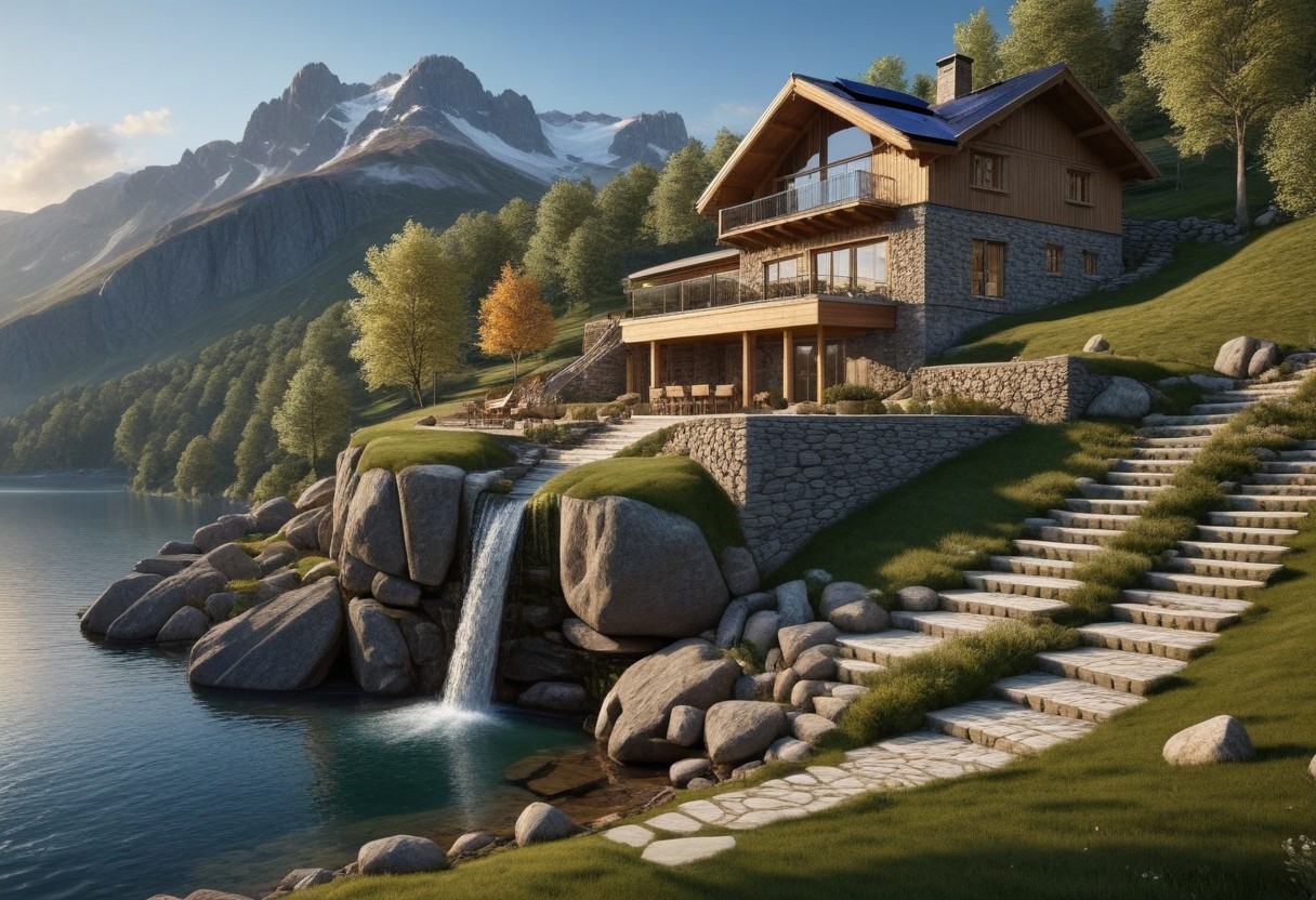 ultra-realistic image with high resolution and stable focus correct and accurate anatomy, correct and accurate objects, perfect detail, in the architectural style of a family house built of stone and wood merging with nature, designed for ecological neutrality of natural materials, in the mountains, forest ,garages,wide porch,outbuildings,table chairs,barbecue,fire pit,swimming pool,cut into the rocks,grass roof,steps,stone path,waterfall,lake,river,ultra realism,photo realism,single story,multi story,slope, wind generators, solar panels, sunset, (winter season), snow, frozen lake, close-up