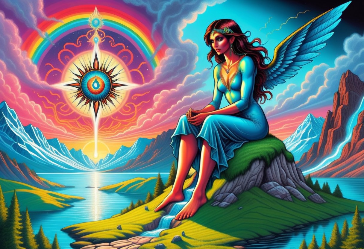 acid-art, trippy, daisyart, tree, cloud, looking at viewer, scenery, sky, water, grass, sun spirit, creepy Hyperrealistic surreal, crystal-clear color line artcolor lineart sketch, lsd-style,trippy, fine line art with super sharp details and vivid colors, intricate textures, and pristine clarity, fairy womans dark gem colored wings, , Exquisite, Whimsical , Intricate detail, color line art, color sketch., surreal, badge, magic atmosphere, rich vivid colors, fertile lsd-style, heart, chains, Daggers, Roses, snakes, Dragon, unicorn, pony, Waldo, Penguin