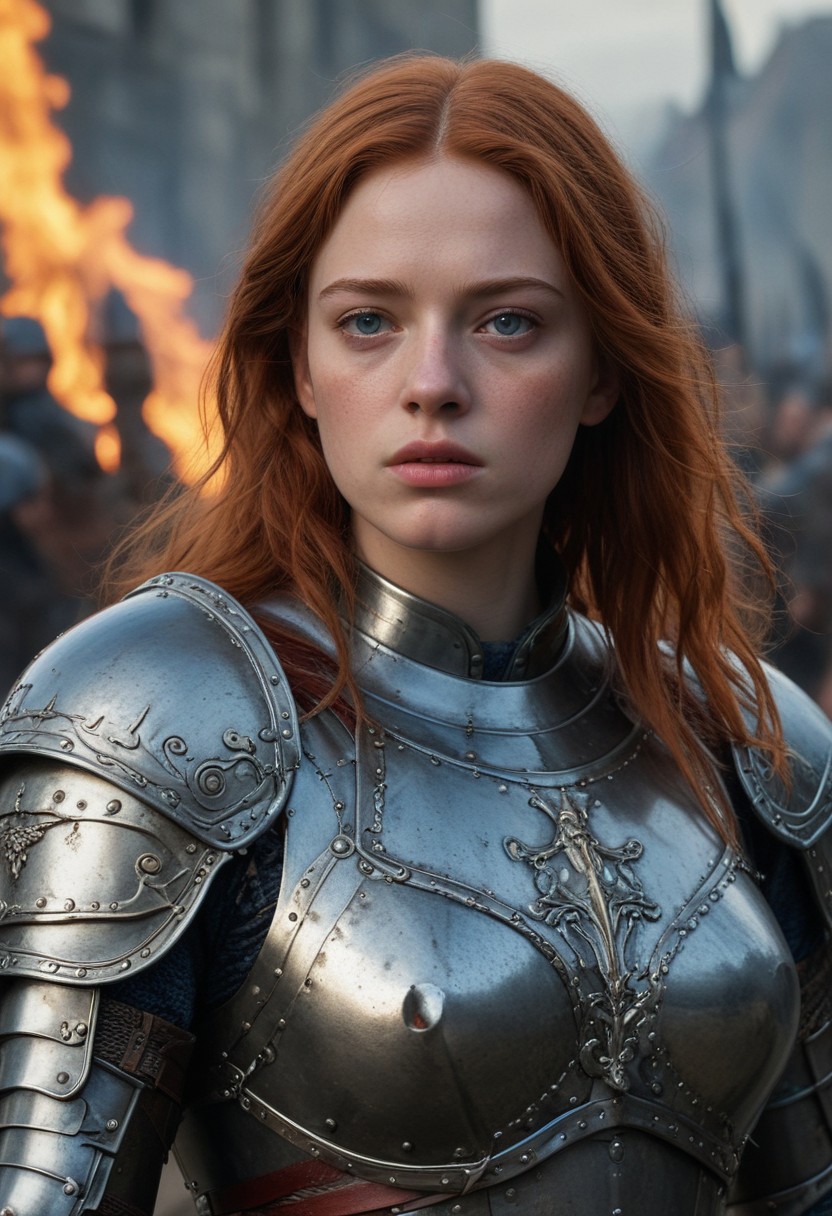 High resolution ultra-realistic of Beautiful Warrior Sadie Sink as Joan of Arc, 8k, capturing the intensity of the moment, cinematic lighting, standing on a bloody and stormy battlefield in bloody battle, wavy red hair, realistic dirty pale face, realistic blue eyes, beautiful hourglass figure, burning in a medieval Town, intricately designed iron and silver armor, red mini skirt, Dark Ages Aesthetic, perfect athletic figure, beautiful Warrior Joan of Arc, fire, ultra realistic, cinematic style, vigorous and seductive, athletic figure, dark fantasy, dramatic lighting, wet and sweaty skin, dirty skin, athletic figure, dark fantasy, dramatic lighting, Greg Rutkowski style,, Warrior Joan of Arc on in iron armor, hyper-detailed, hyper-realistic, bright colours, Attractive 21 old years girl, Attractive, beautiful firm Breasts, sharp focus, digital painting, Photograph Taken on Nikon D750, Alphonse Mucha, 8K, athletic figure, Hyperdetailed, hyperrealism, Attractive, Attractive bust girl, asymmetric balance