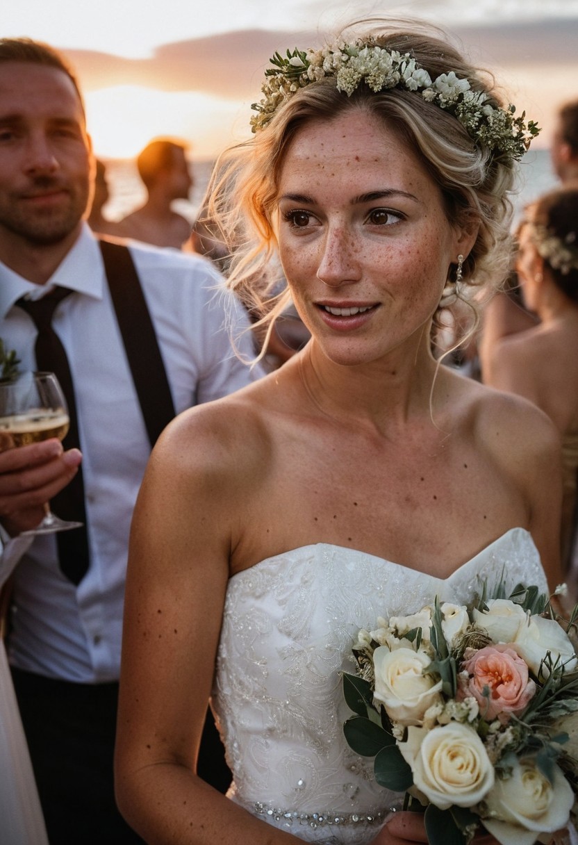 Stunning 35mm photo of a 42 years old Dutch woman, ((an breathtaking wedding dress)), very pretty, fit, skinny, highly detailed face, highly detailed skin, freckles, many freckles on arms and tits, freckles and moles all over body, natural breasts, perfect breasts, hard nipples, Rounded ass, blonde hair, pubic hair, short hair, messy hair, medium hair, brown eyes, highly detailed skin, highly detailed face, in love, happy, detailed pupils, at her wedding party, in a beach club on the Dutch coastline, holding a pretty bouquet of flowers, emotional face, emotional but happy while listening to her new husbands' beautiful speech, sunset, you can tell from the expression on her face that she is highly sexually aroused, low light, soft natural light, Rembrandt style light, made with a Hasselblad camera, 35mm, film grain, masterpiece, sharp focus, ((Photorealistic:1))