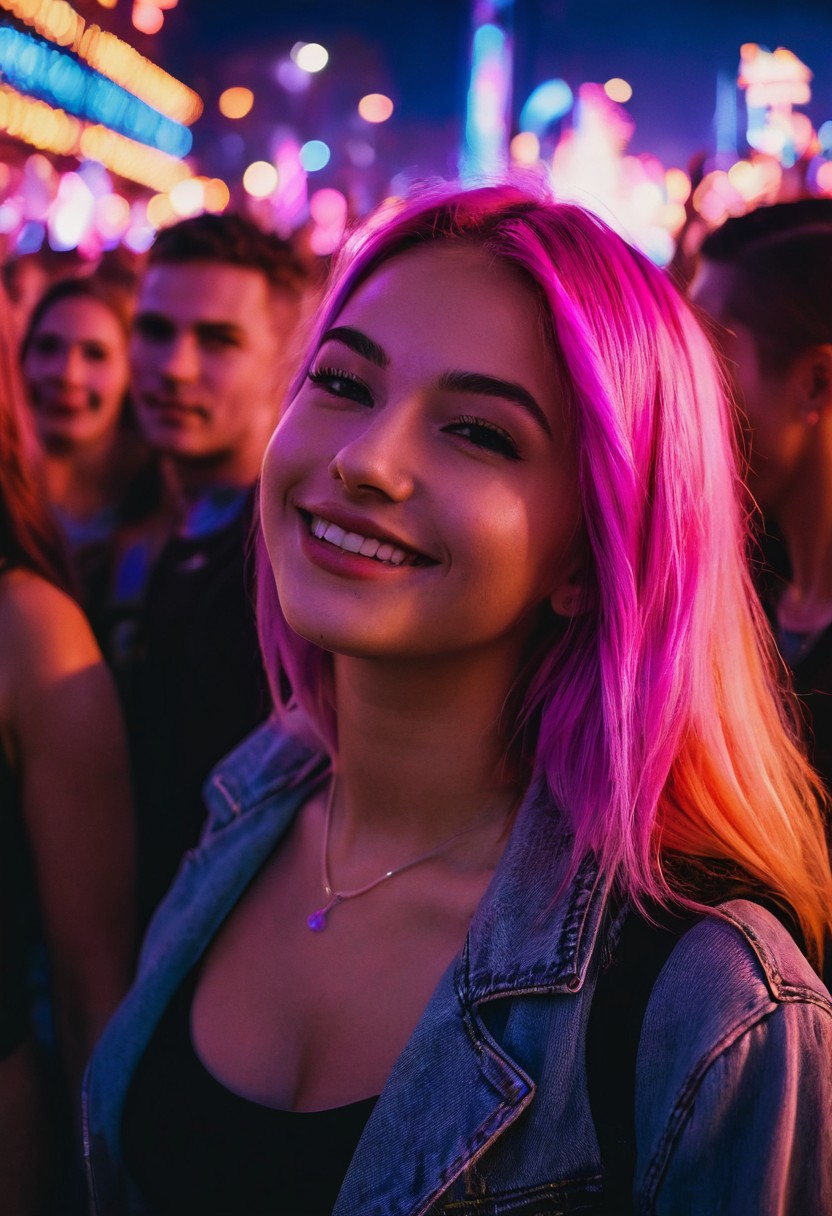 score_9, score_8_up, score_7_up, score_6_up, beautiful 19 year old girl, colored hair, neon lights, rave, rave clothing, crowd, nighttime, dusk, smiling, ultra realistic, big lips, (masterpiece, best quality, highres:1.2), (photorealistic:1.2),
