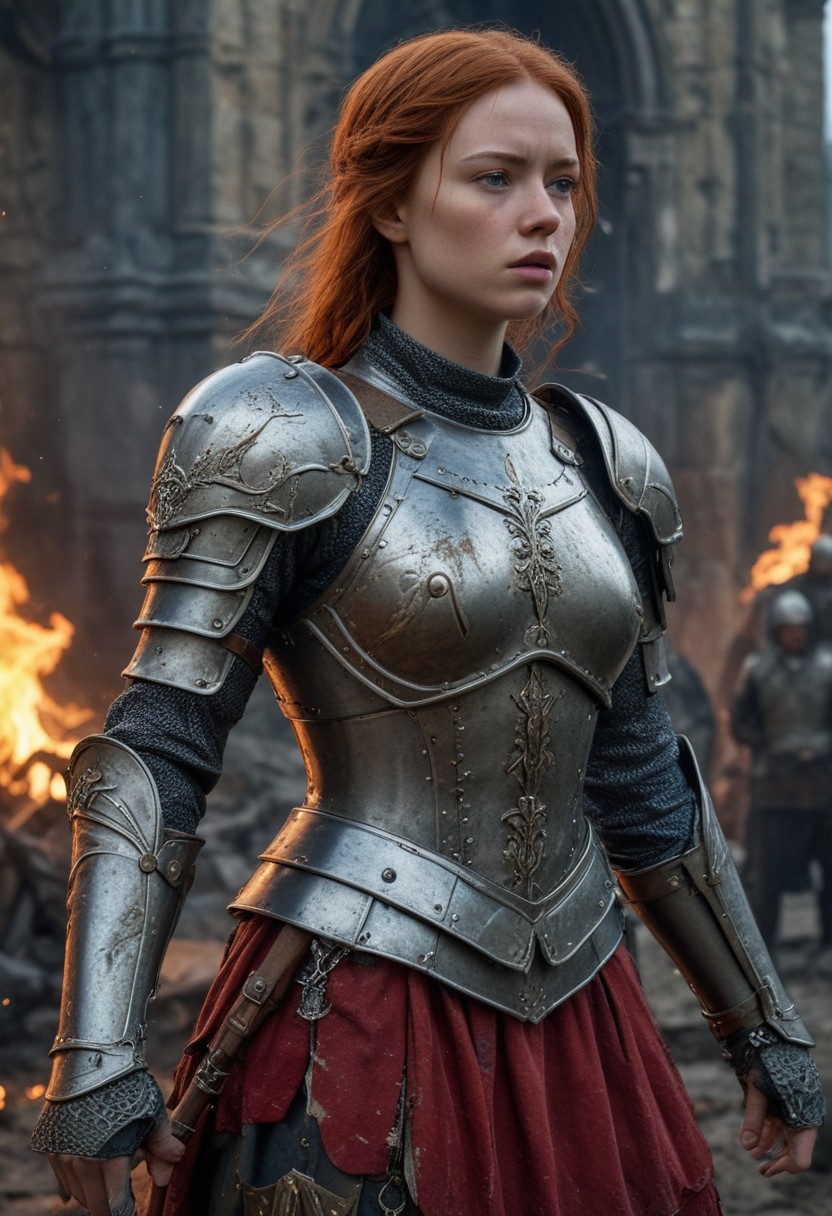 High resolution ultra-realistic of Beautiful Warrior Sadie Sink as Joan of Arc, 8k, capturing the intensity of the moment, cinematic lighting, standing on a bloody and stormy battlefield in bloody battle, wavy red hair, realistic dirty pale face, realistic blue eyes, beautiful hourglass figure, burning in a medieval Town, intricately designed iron and silver armor, red mini skirt, Dark Ages Aesthetic, perfect athletic figure, beautiful Warrior Joan of Arc, fire, ultra realistic, cinematic style, vigorous and seductive, athletic figure, dark fantasy, dramatic lighting, wet and sweaty skin, dirty skin, athletic figure, dark fantasy, dramatic lighting, Greg Rutkowski style,, Warrior Joan of Arc on in iron armor, hyper-detailed, hyper-realistic, bright colours, Attractive 21 old years girl, Attractive, beautiful firm Breasts, sharp focus, digital painting, Photograph Taken on Nikon D750, Alphonse Mucha, 8K, athletic figure, Hyperdetailed, hyperrealism, Attractive, Attractive bust girl, asymmetric balance