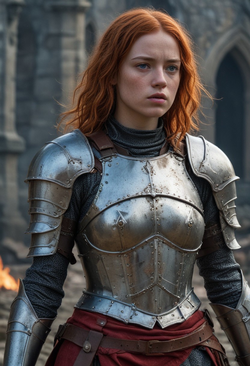 High resolution ultra-realistic of Beautiful Warrior Sadie Sink as Joan of Arc, 8k, capturing the intensity of the moment, cinematic lighting, standing on a bloody and stormy battlefield in bloody battle, wavy red hair, realistic dirty pale face, realistic blue eyes, beautiful hourglass figure, burning in a medieval Town, intricately designed iron and silver armor, red mini skirt, Dark Ages Aesthetic, perfect athletic figure, beautiful Warrior Joan of Arc, fire, ultra realistic, cinematic style, vigorous and seductive, athletic figure, dark fantasy, dramatic lighting, wet and sweaty skin, dirty skin, athletic figure, dark fantasy, dramatic lighting, Greg Rutkowski style,, Warrior Joan of Arc on in iron armor, hyper-detailed, hyper-realistic, bright colours, Attractive 21 old years girl, Attractive, beautiful firm Breasts, sharp focus, digital painting, Photograph Taken on Nikon D750, Alphonse Mucha, 8K, athletic figure, Hyperdetailed, hyperrealism, Attractive, Attractive bust girl, asymmetric balance