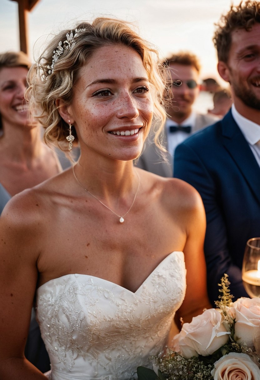 Stunning 35mm photo of a 42 years old Dutch woman, ((an breathtaking wedding dress)), very pretty, fit, skinny, highly detailed face, highly detailed skin, freckles, many freckles on arms and tits, freckles and moles all over body, natural breasts, perfect breasts, hard nipples, Rounded ass, blonde hair, pubic hair, short hair, messy hair, medium hair, brown eyes, highly detailed skin, highly detailed face, in love, happy, detailed pupils, at her wedding party, in a beach club on the Dutch coastline, giving an emotional and beautiful speech at dinner, reading speech from paper, holding piece of paper in her hand, emotional face, emotional but happy, sunset, low light, soft natural light, Rembrandt style light, made with a Hasselblad camera, 35mm, film grain, masterpiece, sharp focus, shot on Kodak, lens flare, cinematic, (ultra high res: 1.2), (photo-realistic: 1.3) (skin pores: 1.1)