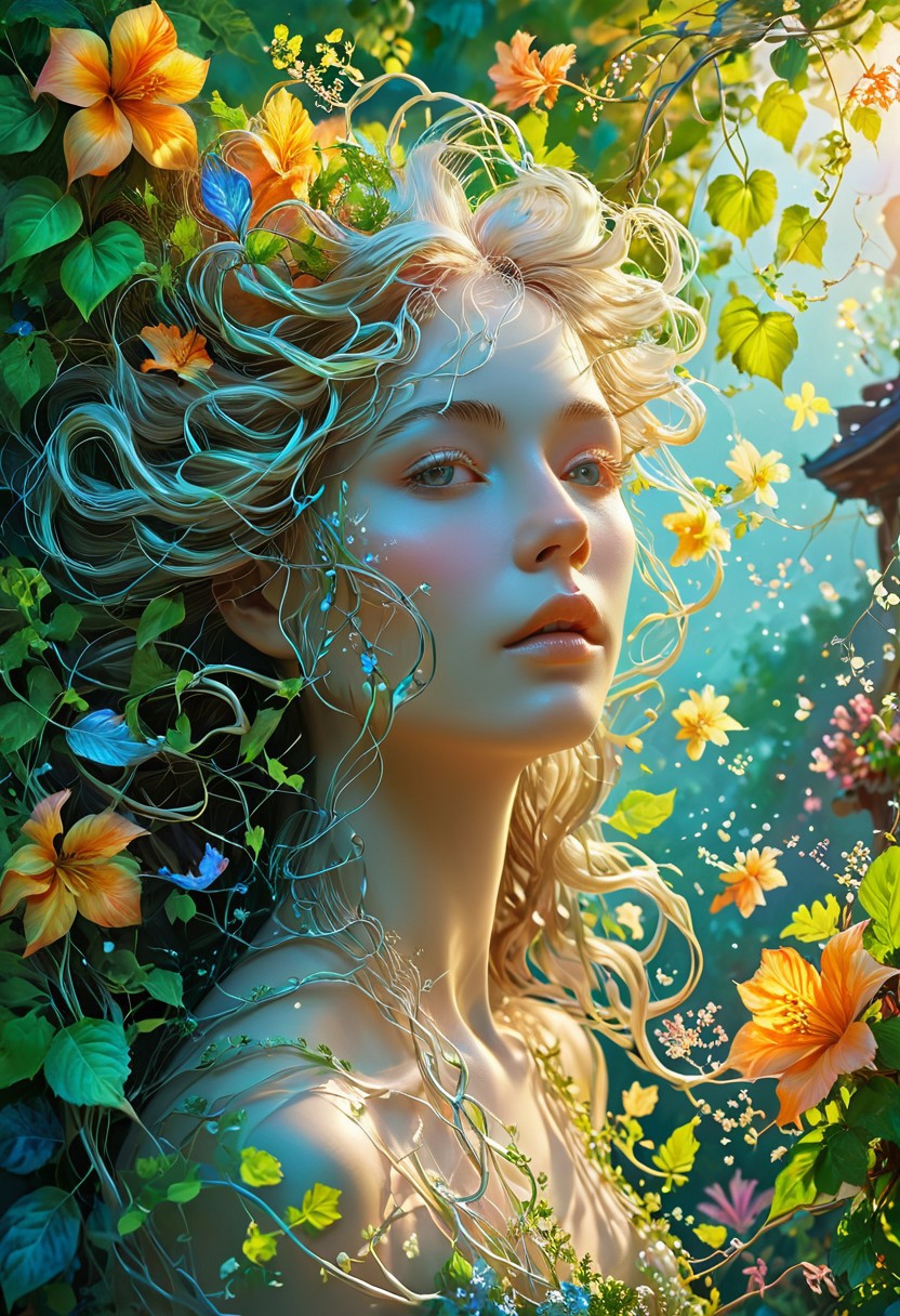 A dreamlike digital painting features a woman with surreal characteristics. Her ethereal hair, composed of twisting vines, flows gracefully around her. Her eyes shimmer with an opalescent quality, adding to her otherworldly appeal. Springtime colors, such as vibrant leaves and blossoming flowers, decorate her skin, further enhancing her otherworldly beauty. The background remains pale, providing a subtle yet effective contrast to the vivid elements of the composition.