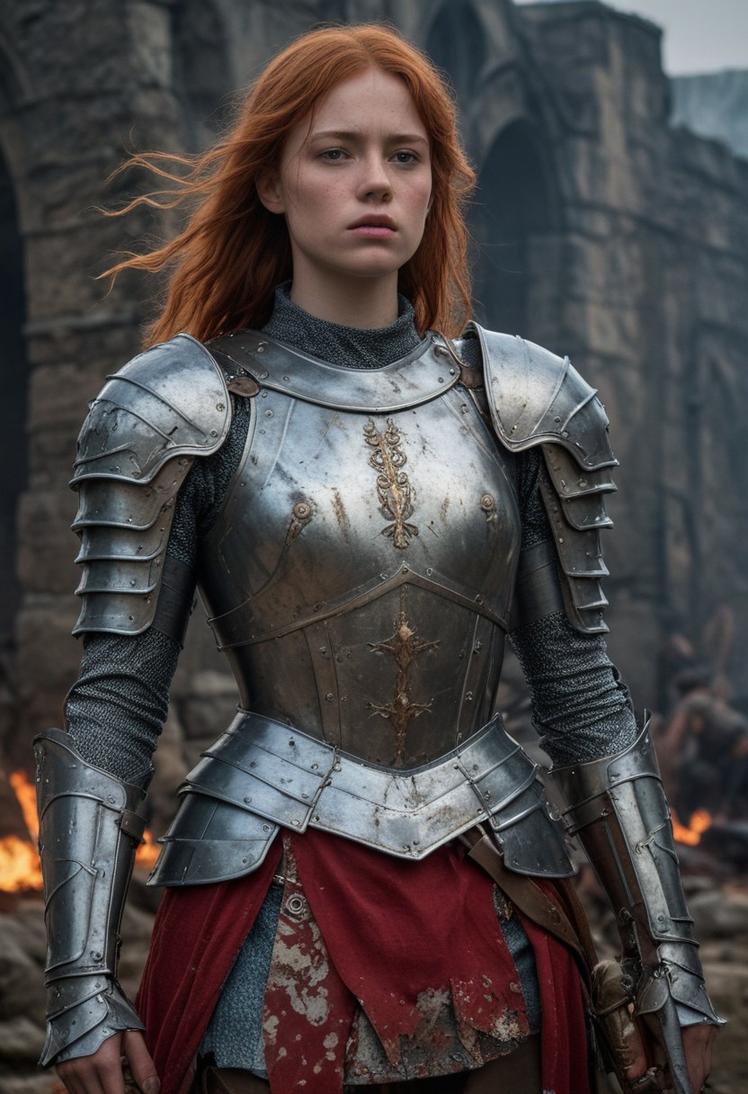 High resolution ultra-realistic of Beautiful Warrior Sadie Sink as Joan of Arc, 8k, capturing the intensity of the moment, cinematic lighting, standing on a bloody and stormy battlefield in bloody battle, wavy red hair, realistic dirty pale face, realistic blue eyes, beautiful hourglass figure, burning in a medieval Town, intricately designed iron and silver armor, red mini skirt, Dark Ages Aesthetic, perfect athletic figure, beautiful Warrior Joan of Arc, fire, ultra realistic, cinematic style, vigorous and seductive, athletic figure, dark fantasy, dramatic lighting, wet and sweaty skin, dirty skin, athletic figure, dark fantasy, dramatic lighting, Greg Rutkowski style,, Warrior Joan of Arc on in iron armor, hyper-detailed, hyper-realistic, bright colours, Attractive 21 old years girl, Attractive, beautiful firm Breasts, sharp focus, digital painting, Photograph Taken on Nikon D750, Alphonse Mucha, 8K, athletic figure, Hyperdetailed, hyperrealism, Attractive, Attractive bust girl, asymmetric balance