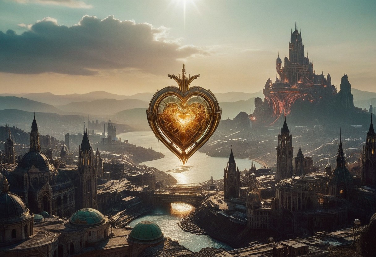 An aerial view of a dark floating city hovering over a parched valley. Above the city, a giant bleeding gold mechanical heart floats in the sky, elaborately crafted in the Art Nouveau style. The heart is surrounded by delicate, intricate patterns that reflect the sunlight and cast a greenish glow, an ethereal glow, onto the city below. The scene conveys a dark science fiction atmosphere reminiscent of classic sci-fi art, with an emphasis on futuristic and figurative elements. The composition and lighting of the image are inspired by techniques used by some of the most famous photographers.