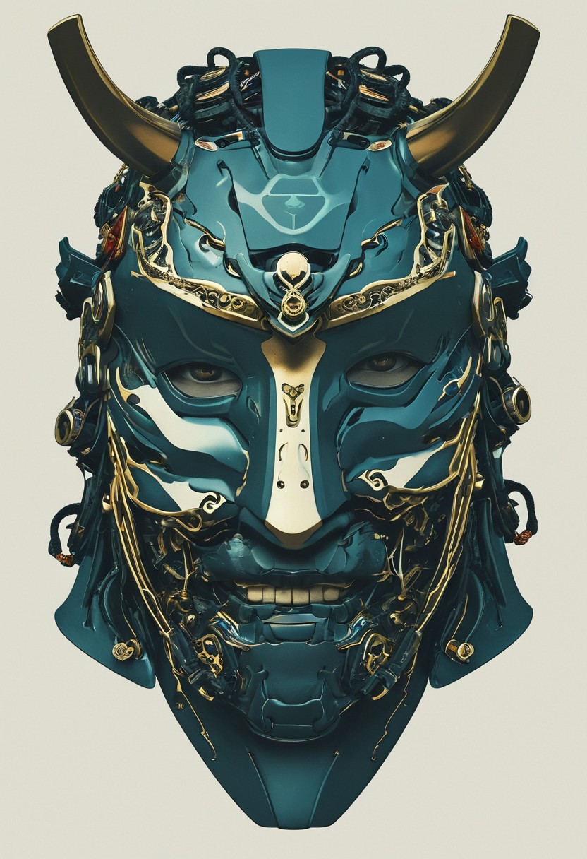 (S1n0z1ck Style) A digitally rendered illustration features a samurai adorned with a futuristic, cybernetic mask, expertly portrayed using a minimalistic flat color palette.