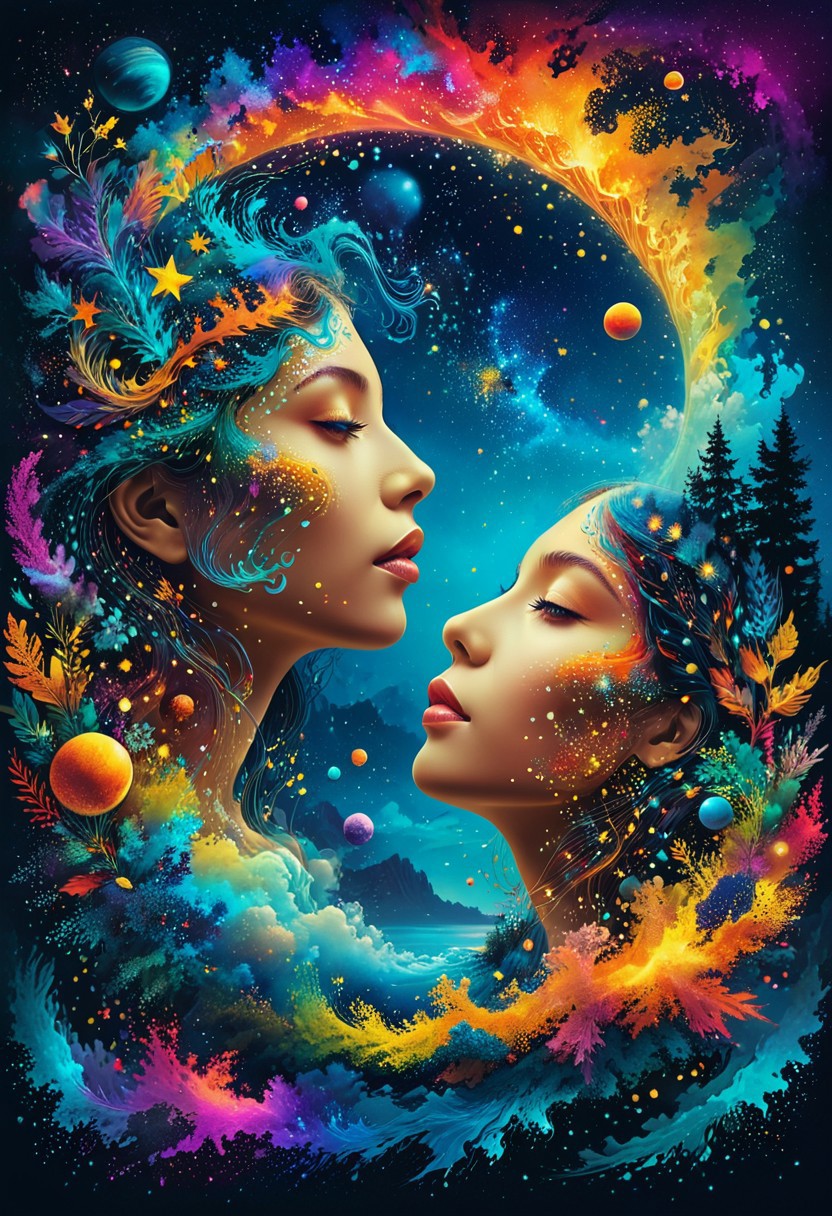 This enchanting double exposure digital artwork masterfully combines two faces, each adorned with intricate, colorful patterns, into one mesmerizing image. The faces are encircled by a swirling galaxy of luminous planets and stars, juxtaposed against a serene taiga landscape with a flowing river in the foreground. The style captivates with its blend of psychedelic art deco, abstract surrealism, and fantasy pop art, while the vibrant and saturated colors evoke a dreamlike, otherworldly atmosphere. This captivating piece would make an extraordinary phone wallpaper, poster, or any form of contemporary art that transcends time and space.