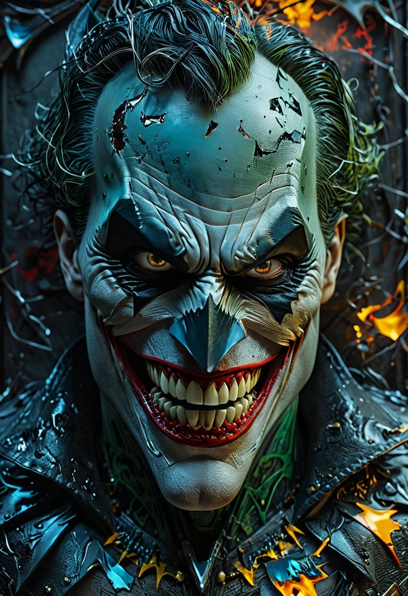 Merging elements of Batman and The Joker, this character portrays an evil, maniacal laughter, a sinister grin, and piercing eyes, accompanied by inhumanly sharp fangs. In a half-body portrait, Batman appears maniacal, gazing into a shattered mirror, his image rendered in Todd Phillips' unique style. The scene exudes an atmosphere of darkness, horror, and intense drama, with dramatic lighting and high-quality, hyper-realistic visuals. Inspired by the style of illusory wallpaper portraits, the image showcases colorful realism, exceptional attention to detail, and intricate hidden elements. The UHD, 8K resolution delivers a stunning image, combining realism and vibrant colors for an immersive, intense experience.