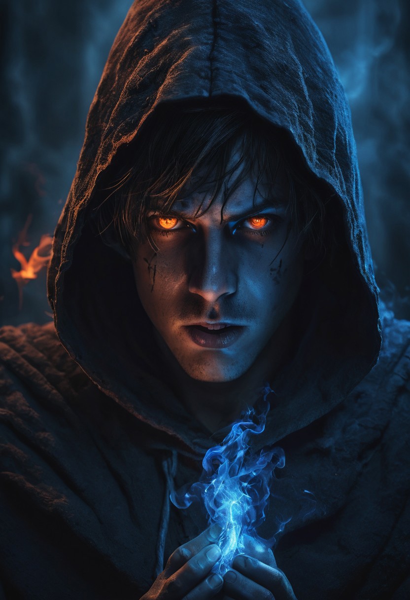 Dark Fantasy Concept Art. Close-up portrait. 23-year-old boy engulfed in dark power, wearing a hooded robe, bright blue eyes, intensely angry. Macro. High-contrast matte painting with intricate textures and deep color. Bright blue eyes gleaming against dark wisps of smoke and neon magical runes. Dark, rugged, stone-like shadows consuming the boy's body. Complementary colors of fiery orange and indigo, backlit by an eerie blue glow. Highly detailed, fantasy concept art, Unreal Engine 5 quality, Artstation trending style, 8k resolution, cinematic lighting, best quality, incredibly detailed, visually striking, surreal, immersive, extrmeley detailed supervillian