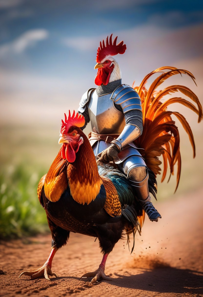 a tiny errant knight riding a rooster to battle, epic photo, action photography, comical and funny, colorful scene,