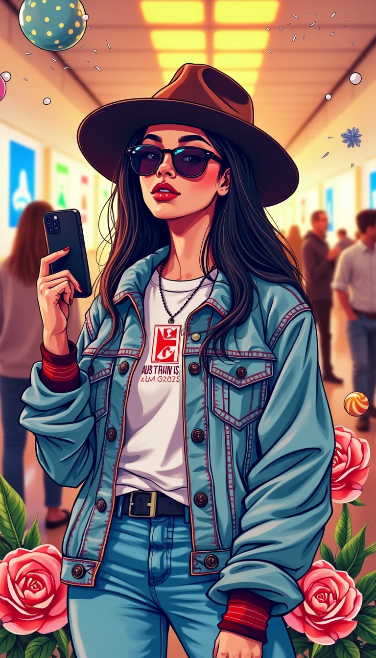 IMG_1028.CR2: Create a vibrant illustration-inspired portrait of a female posing confidently in a bustling Apple Store in New York, America. She's wearing a cool hat, trendy sunglasses, and a fashionable streetwear jacket, and holding an iPhone 16 amidst swirling colorful texts and whimsical flowers and candy elements. The image should exude a sense of modernity, style, and confidence, with highly detailed textures and intricate patterns rendered in ultra-high resolution 4K UHD. The scene is rendered in 4500 HD CGI