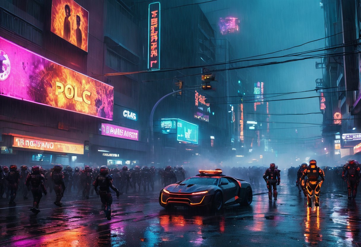 Futuristic cyberpunk scene in the year 2099 of huge mob of humanoid robots rioting on streets, futuristic tech everywhere, futuristic cyberpunk cars, chaos everywhere, robots turning cars over, fires, people running, night, raining, wet asphalt, futuristic police, fire, smoke, neon lights, cinematic