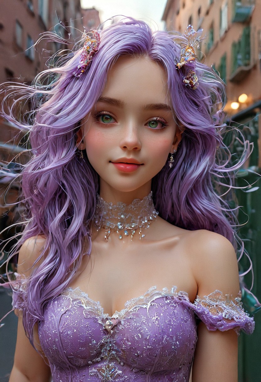 In a vibrant, playful scene, c0l0urc0r3 portrays a cute young woman with faded bright colors, showcasing ultra-detailed, dynamic sunlights and shades. The one adorable woman, with her slender body and bare belly, has light purple hair styled in wavy locks. Her shiny hazel green eyes sparkle, and she wears cute goggles on her head, displaying a smile and large breasts with ample cleavage. The woman's bare shoulder adds to her allure as she looks directly at the viewer, displaying a high angle shot. The summer day takes place in a park, with lots of candy in the air, frozen in time as if captured by a magical moment. Her dynamic pose and the captivating atmosphere create an unforgettable image, leaving a lasting impression on those who witness it.