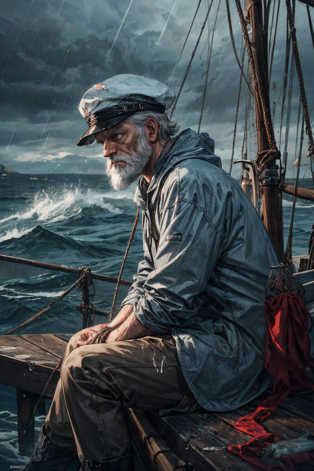 (RAW photo, 8k uhd, Analog style, Masterpiece, Best Quality, Highres:1.4), (dramatic, cinematic:1.2), BREAK, movie shot of (80 yo:1.2) (old male:1.3) (fisherman:1.25) (sailor man:1.25) (sitting:1.1) (on deck:1.35) of (old dilapidated:1.2) (wooden sailboat:1.3), against railing, (from side:1.2), (stern face:1.2), (deep wrinkles:1.2), (gray long beard:1.3), (grey eyes:1.2), ((shabby:1.2) old (torn:1.15) (raincoat:1.1), brown (pants:1.1), (sailor hat:1.1) (sou'wester:1.2), jackboots:1.1), (lowered head:1.2), (tired sad expression:1.15), BREAK, (stormy sea, gloomy dark clouds:1.2) on background, (splashes, water drops, rain:1.25), (seafoam:1.1), (flying white seagulls:1.25), (rocks, cliffs:1.3), (dark haze:1.2), (wet clothes:1.1), fishing (nets with fish:1.3) on deck, (ropes:1.1), (tense hopeless eerie atmosphere, cold, floes:1.2), BREAK, (photorealistic:1.3), (rough details, (male focus:1.1):1.2), (desaturated, cold lighting:1.3), (hyperdetailed, absurdres:1.2), BREAK, <lora:more_details:0.9>, <lora:zoom_slider_v1:4.5>,