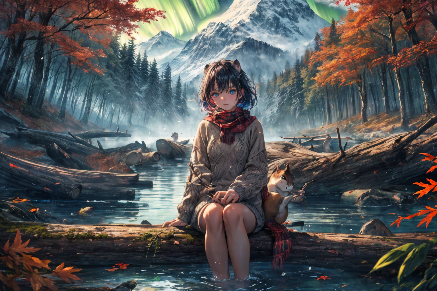 (RAW photo, 8k uhd, Analog style, Masterpiece, Best Quality, Highres:1.3), (dramatic, cinematic:1.2), BREAK, movie shot of realistic (1beaver:1.35) wearing (sweater:1.4) (sitting:1.2) on (island on lake:1.2), (beaver tail, (paws:1.05):1.15), (holding stick:1.1), (river, detailed autumn mapple pine forest:1.2), (fabulous small house, beaver village:1.2), (mountains:1.1), (falling leaves:1.2), (wooden (logs:1.15), (moss:1.1):1.2), (morning, fluffy cloud:1.25), (godrays, light particles, colorful:1.3), looking at viewer, (frontal:1.2), BREAK, (photorealistic, no humans:1.3), (quadruped:1.35), (wearing plaid sweater:1.35), ((scarf:1.1), cute (eyes:1.15), full body:1.1), (wildlife photo, photo by discovery channel:1.2), (fantasy fabulous dream world, shiny:1.3), (soothing calm mood:1.2), (scandinavian northern nature, outdoors, steam, waterfall, cliff, (aurora:1.05):1.1), snow, brown, (rodent teeth:1.1), BREAK, <lora:more_details:0.8>, <lora:zoom_slider_v1:3.8>,