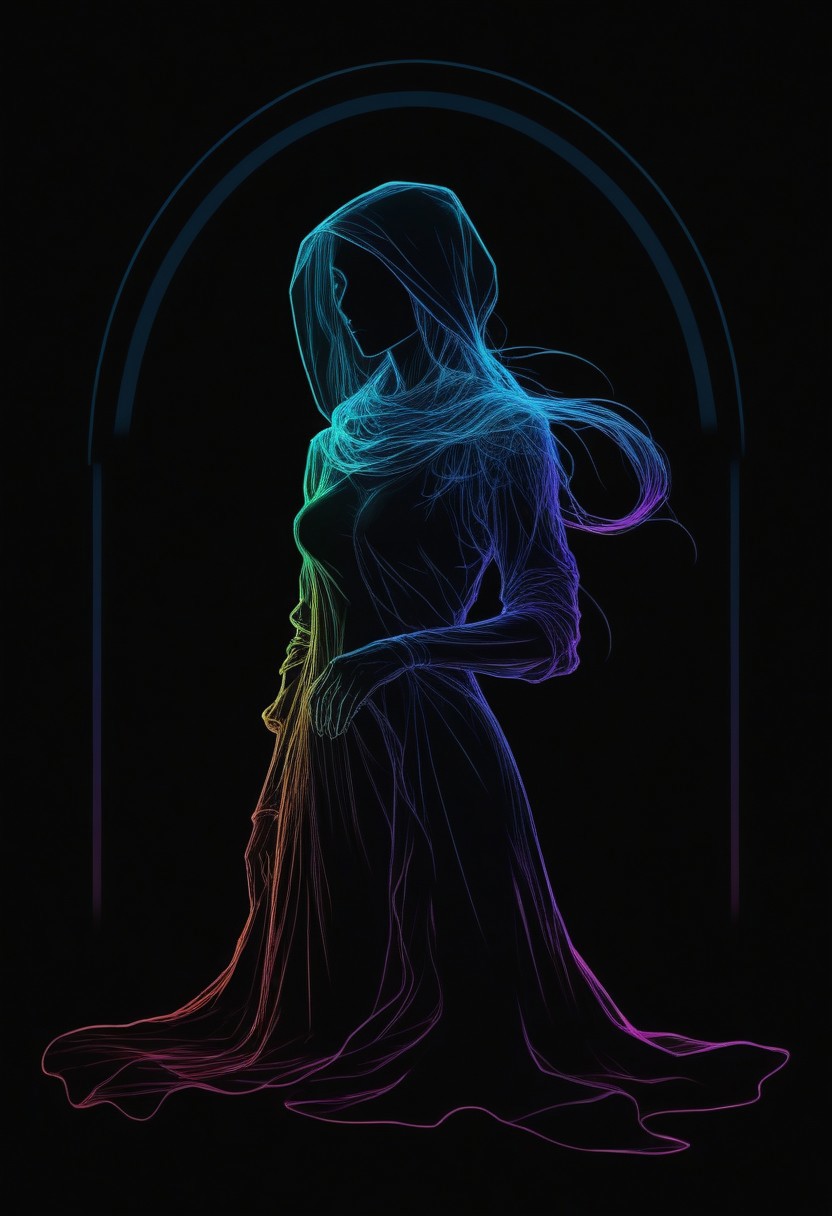 rainbow colored silhoutte outline against a dark background,a female reaper,anime,magical fantasy,universe,inspired by Maria Kreyn,Crystal,inverted,negative space,