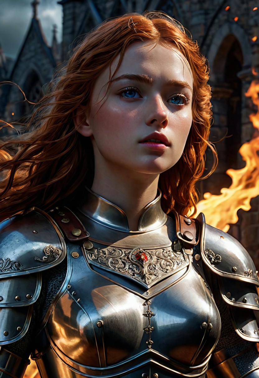 High resolution ultra-realistic of Beautiful Warrior Sadie Sink as Joan of Arc, 8k, capturing the intensity of the moment, cinematic lighting, standing on a bloody and stormy battlefield in bloody battle, wavy red hair, realistic dirty pale face, realistic blue eyes, beautiful hourglass figure, burning in a medieval Town, intricately designed iron and silver armor, Dark Ages Aesthetic, perfect athletic figure, beautiful Warrior Joan of Arc, fire, ultra realistic, cinematic style, vigorous and seductive, athletic figure, dark fantasy, dramatic lighting, wet and sweaty skin, dirty skin, athletic figure, dark fantasy, dramatic lighting, Greg Rutkowski style,, Warrior Joan of Arc on in iron armor, hyper-detailed, hyper-realistic, bright colours, Attractive 21 old years girl, Attractive, beautiful firm Breasts, sharp focus, digital painting, Photograph Taken on Nikon D750, Alphonse Mucha, 8K, athletic figure, Hyperdetailed, hyperrealism, Attractive, Attractive bust girl, asymmetric balance