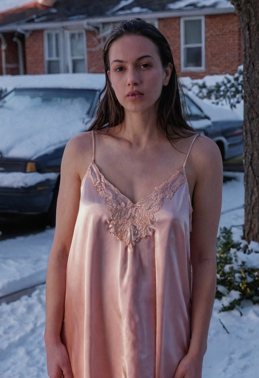 A beautiful female, wearing a peach satin nightgown, in her front yard, snow, December, dusk, street photography, detailed, closeup, early 2000s, DSLR, UHD