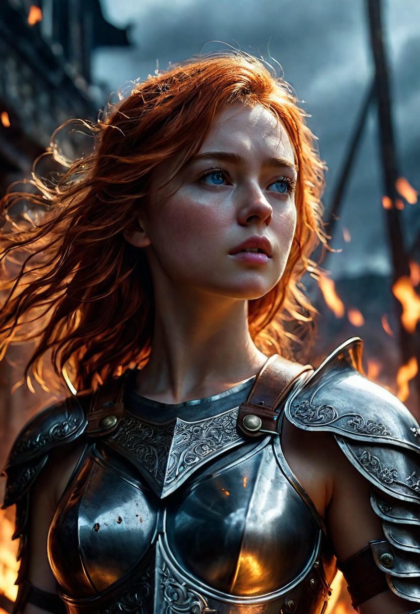High resolution ultra-realistic of Beautiful Warrior Sadie Sink as Joan of Arc, 8k, capturing the intensity of the moment, cinematic lighting, standing on a bloody and stormy battlefield in bloody battle, wavy red hair, realistic dirty pale face, realistic blue eyes, beautiful hourglass figure, burning in a medieval Town, intricately designed iron and silver armor, Dark Ages Aesthetic, perfect athletic figure, beautiful Warrior Joan of Arc, fire, ultra realistic, cinematic style, vigorous and seductive, athletic figure, dark fantasy, dramatic lighting, wet and sweaty skin, dirty skin, athletic figure, dark fantasy, dramatic lighting, Greg Rutkowski style,, Warrior Joan of Arc on in iron armor, hyper-detailed, hyper-realistic, bright colours, Attractive 21 old years girl, Attractive, beautiful firm Breasts, sharp focus, digital painting, Photograph Taken on Nikon D750, Alphonse Mucha, 8K, athletic figure, Hyperdetailed, hyperrealism, Attractive, Attractive bust girl, asymmetric balance