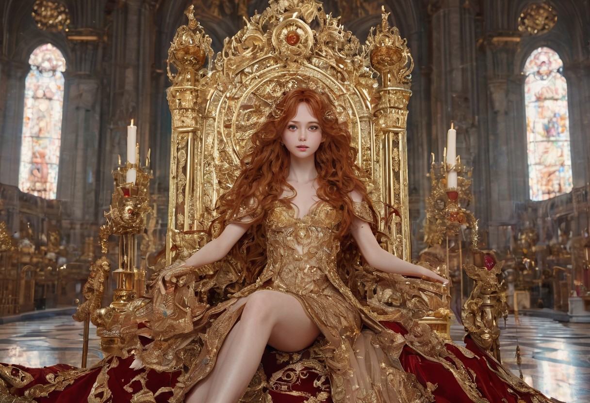 score_9, score_8_up, score_7_up, score_6_up, score_5_up, score_4_up, 1girl(Tall, dainty, red hair, flowing hair, highly detailed golden dress, brown eyes, magic scepter, cute face) sitting on ornate throne in a large cathedral full body shot, 8k, high quality, indoors, bright light, FastNegativeV2