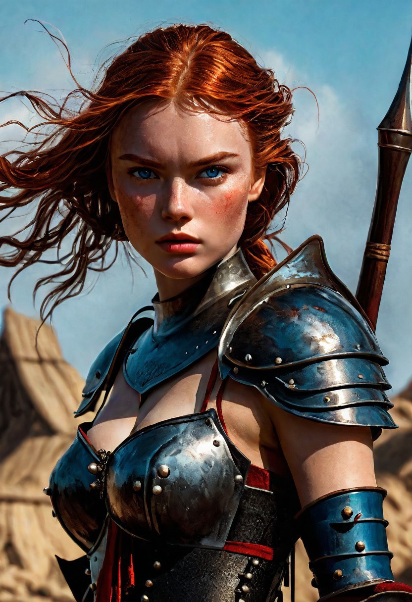High resolution ultra-realistic of Beautiful Warrior girl, 8k, capturing the intensity of the moment, cinematic lighting, standing on a bloody and turbulent battlefield in a bloody battle, wavy red hair, realistic dirty pale face, realistic blue eyes, beautiful hourglass figure, burning in a fantasy Town, intricately designed cloth dirty black-red robes, fantasy Aesthetic, perfect athletic figure, beautiful Sadie Sink as Warrior Knightess, ultra realistic, cinematic style, vigorous and seductive, beautiful firm Breasts. athletic figure, dark fantasy style, dramatic lighting, wet and sweaty skin, dirty skin, athletic figure, dark fantasy, dramatic lighting, Greg Rutkowski style, Warrior Knightess on in armor, hyper-detailed, hyper-realistic, natural light, extremely intricate details, masterpiece, epic, bright colours, Attractive 21 old years girl, Attractive, sharp focus, digital painting, Photograph Taken on Nikon D750, Alphonse Mucha, 8K, athletic figure, Hyperdetailed, hyperrealism, Attractive, Attractive bust girl, asymmetric balance