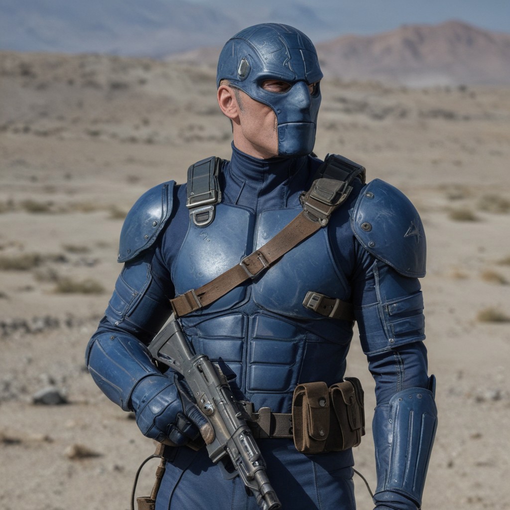 a close up of a man with a gun, cable, realistically proportioned head, dark blue leather armor, inspired by Paul Pelletier, solo male weary soldier, hydra, official photo, the price of ncr, full length character, anorexic, in a wasteland