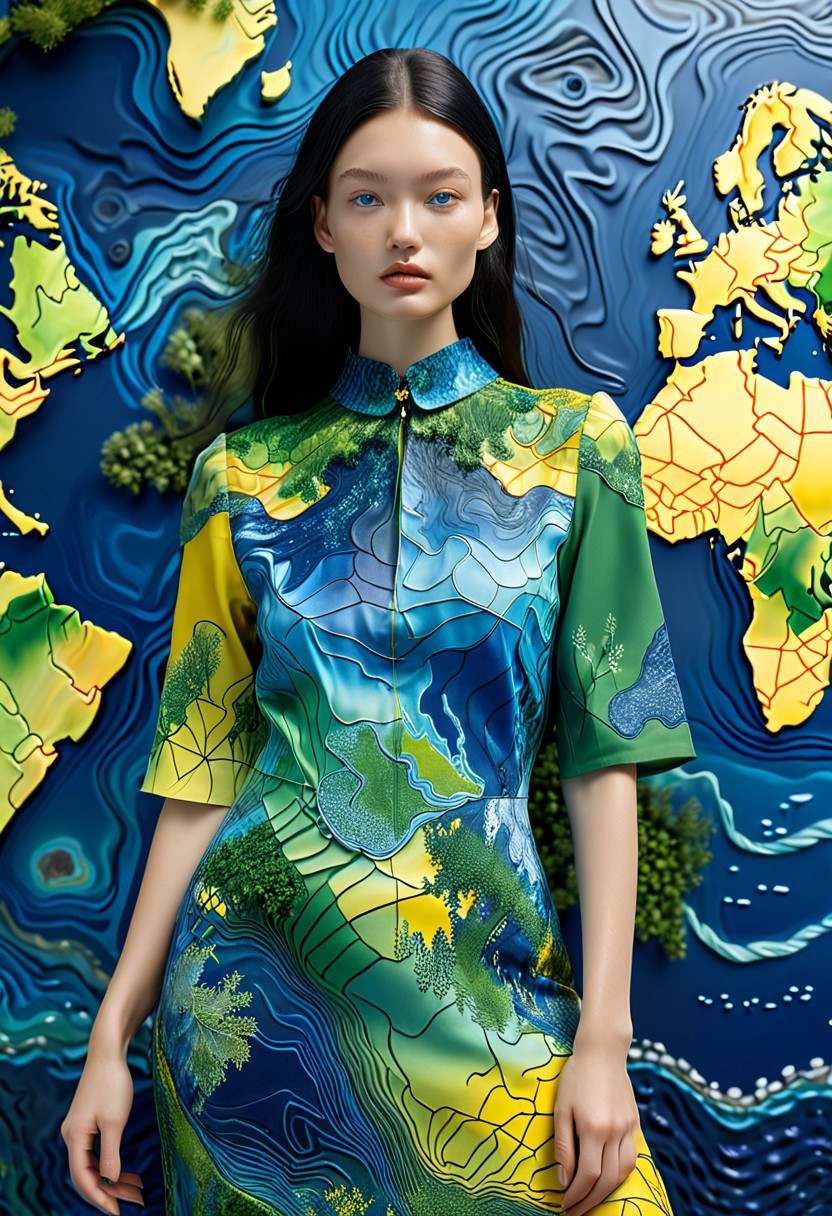 A photograph captures a caucasian model adorned with a dress that resembles a topographical map of the Earth. The attire combines numerous shades of blue, green, and yellow to represent water, vegetation, and urban regions. The dress features a grid pattern on the shoulders and arms. The model's hair and eyes are accentuated with gleaming patterns. The backdrop is dark and enigmatic.