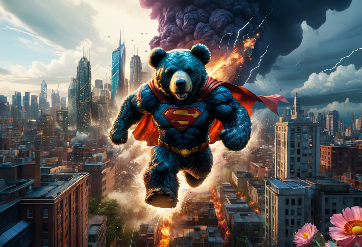 Huge teddybear running towards viewer with superman-cape on steel-beam high above skyscraper city, lightning, big explosion behind teddybear,Digital watercolor Illustration of a thunderstorm, by Waterhouse, Carne Griffiths, Minjae Lee, Ana Paula Hoppe, Stylized watercolor art, Intricate, Complex contrast, HDR, Sharp, soft Cinematic Volumetric lighting, flowery pastel colors, wide long shot, perfect masterpiecedetailed matte painting, deep color, fantastical, intricate detail, splash screen, complementary colors, fantasy concept art, 8k resolution trending on Artstation Unreal Engine 5, SoraSleepAI, Circle