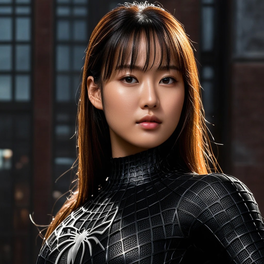 score_9, score_8_up, score_7_up, best quality, realistic, masterpiece, beautiful detail, hyperrealistic, ((1girl, woman body, big breasts)), amazing detailed full body of a cute korean girl, cute face, wearing a realistic and highly detailed black raimi spider-man suit, ((defined muscular girl)), professional model wears ultra - detailed black raimi spider - man suit, ultra - detailed and grained black raimi spiderman suit, suit covered entire body and hand, black spiderman gloves, wet, close up, octane render, highly detailed, volumetric, dramatic lighting, (highest quality:1.1), (HDR:1.3), (top quality, best quality), realistic, high definition, masterpiece, 8k, best quality, best illumination, best shadow, an extremely delicate and beautiful, finely detail, depth of field, classic, highres, perfect lighting,