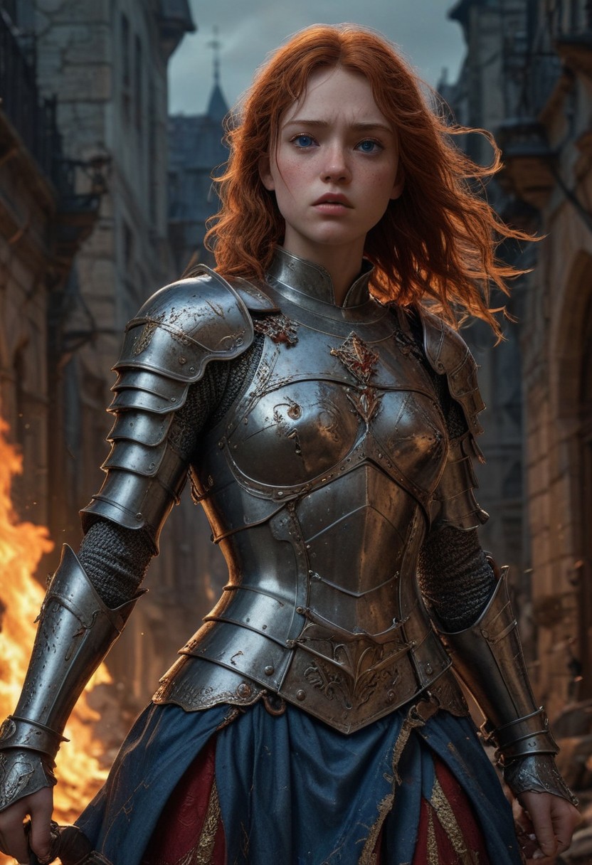 High resolution ultra-realistic of Beautiful Warrior Sadie Sink as Joan of Arc, 8k, capturing the intensity of the moment, cinematic lighting, standing on a bloody and stormy battlefield in bloody battle, wavy red hair, realistic dirty pale face, realistic blue eyes, beautiful hourglass figure, burning in a medieval Town, intricately designed iron and silver armor, red mini skirt, Dark Ages Aesthetic, perfect athletic figure, beautiful Warrior Joan of Arc, fire, ultra realistic, cinematic style, vigorous and seductive, athletic figure, dark fantasy, dramatic lighting, wet and sweaty skin, dirty skin, athletic figure, dark fantasy, dramatic lighting, Greg Rutkowski style,, Warrior Joan of Arc on in iron armor, hyper-detailed, hyper-realistic, bright colours, Attractive 21 old years girl, Attractive, beautiful firm Breasts, sharp focus, digital painting, Photograph Taken on Nikon D750, Alphonse Mucha, 8K, athletic figure, Hyperdetailed, hyperrealism, Attractive, Attractive bust girl, asymmetric balance