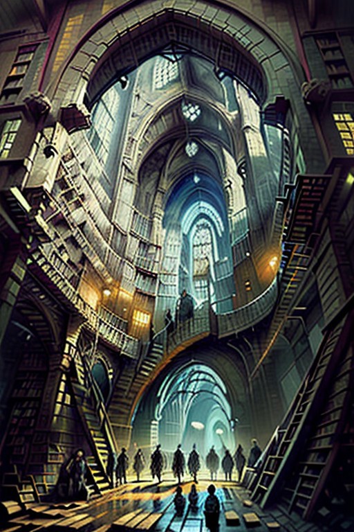 Dungeons and Dragons, large library, tons of people walking around, inside library, Half-timbered Construction, oil painting, fantasy00d