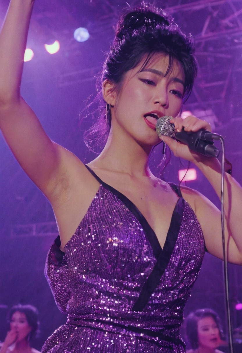 A Japanese singer, wearing a purple shoulderless v-neck dress, high tied up hair, black hair, makeup, on a performance stage, singing, glitter, studio lights, neon lights, confetti, the 1980s, VHS Footage, detailed, UHD, sharp lighting, DSLR
