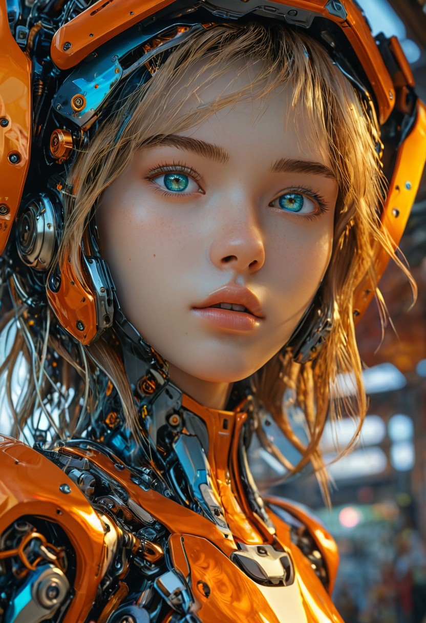 This exceptional masterpiece boasts unparalleled quality, showcasing extreme detail and hyper-realistic elements. The scene features a stunning, 18-year-old girl with perfect features, a slim body, and flawless skin. Her detailed eyes and natural beauty captivate the viewer, while the mecha in the background adds a futuristic touch. The image's vibrant colors and low-angle perspective make this a truly remarkable work of art.