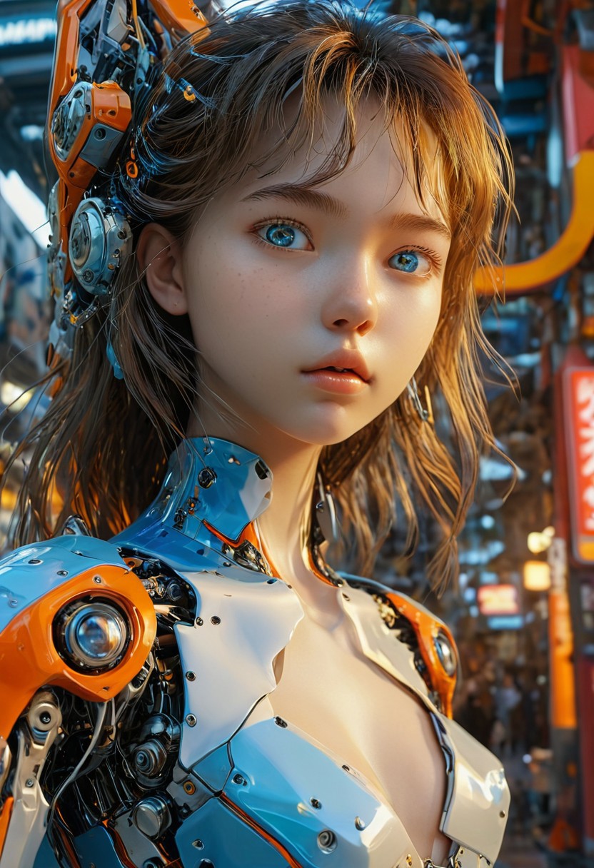 This exceptional masterpiece boasts unparalleled quality, showcasing extreme detail and hyper-realistic elements. The scene features a stunning, 18-year-old girl with perfect features, a slim body, and flawless skin. Her detailed eyes and natural beauty captivate the viewer, while the mecha in the background adds a futuristic touch. The image's vibrant colors and low-angle perspective make this a truly remarkable work of art.