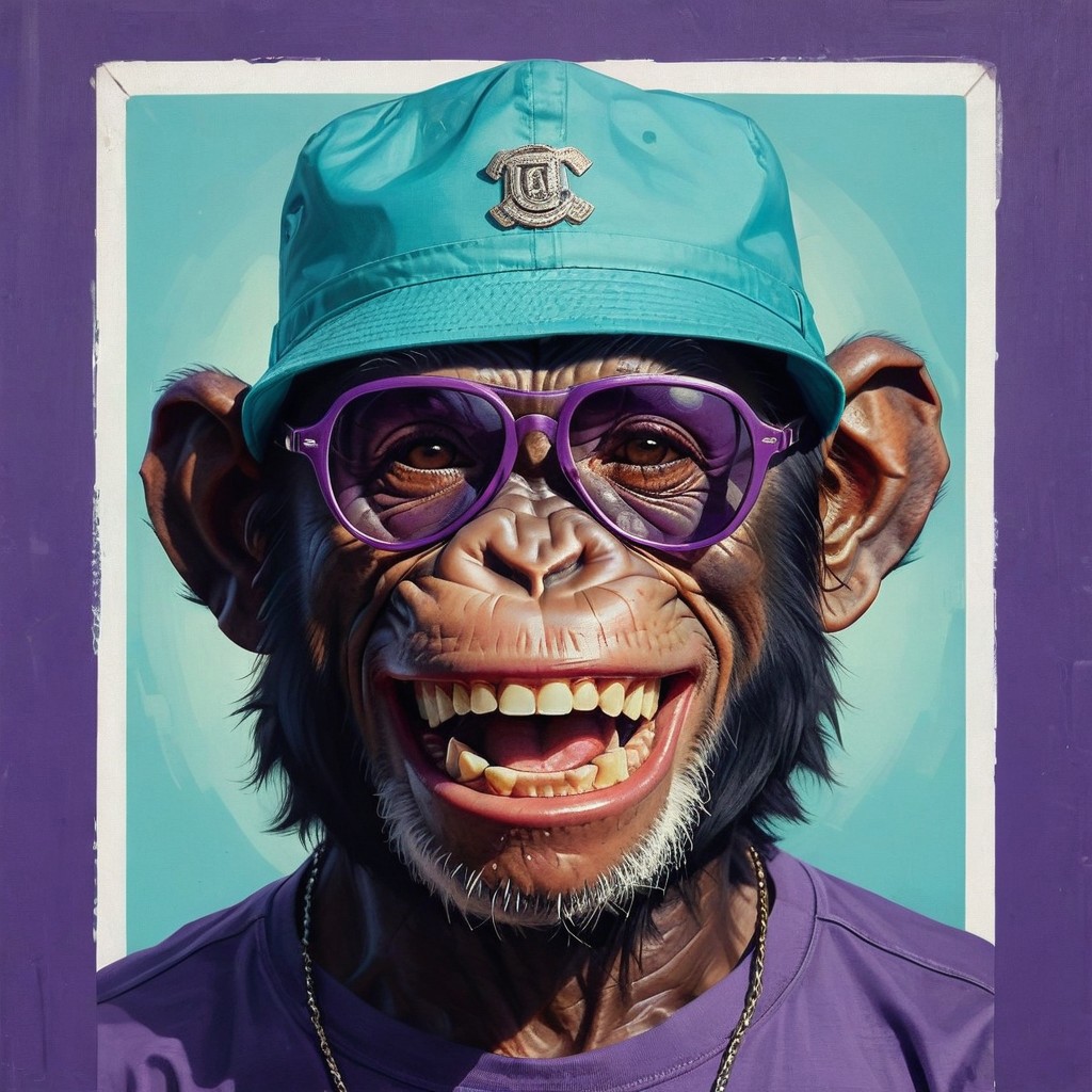 closeup portrait of a chimp, lucky laugh face, bucket hat on head, highly detailed, evocative, high contrast, purple and turquoise color blocks as the background, retro style white frame sunglasses, lucky laugh face, tshirt purple weared