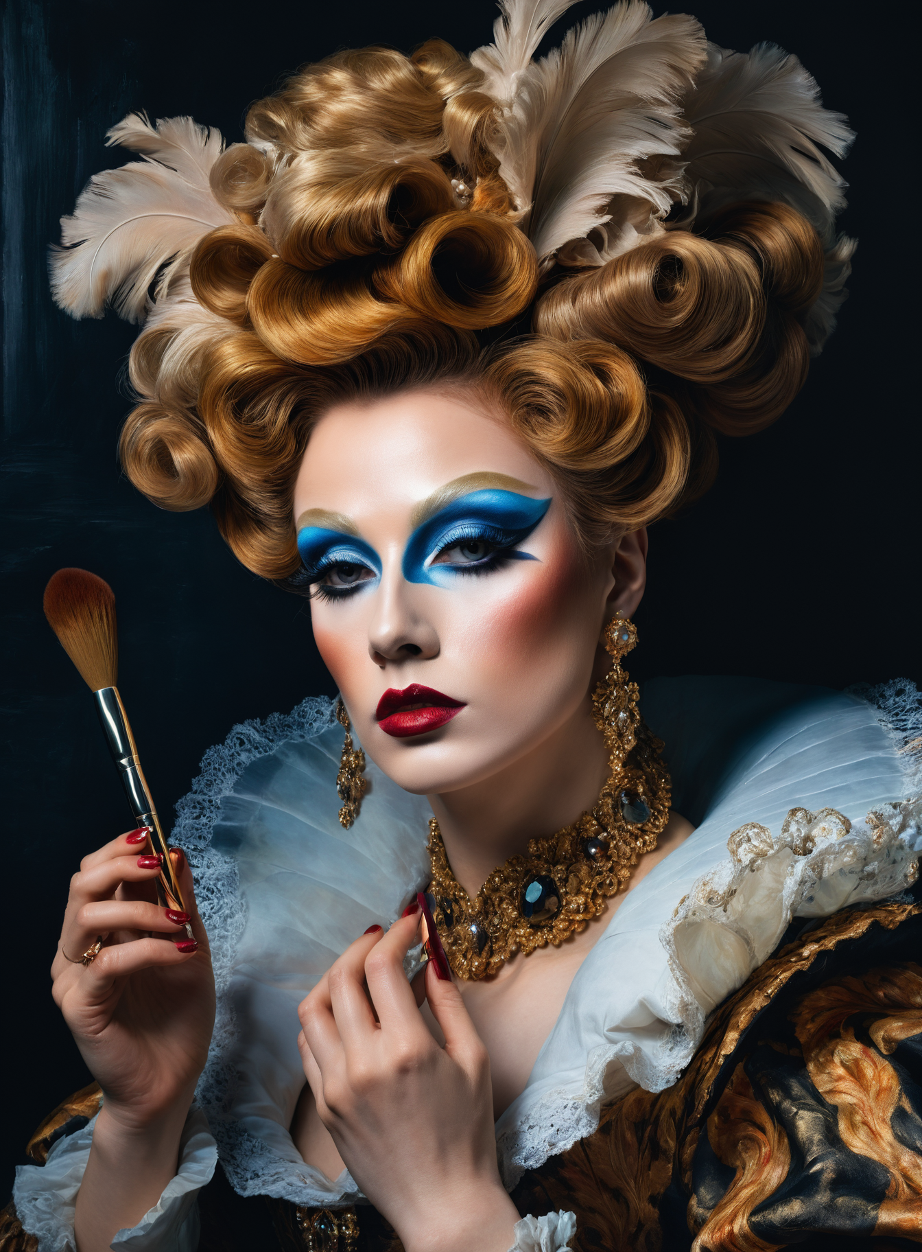 a dramatic painting of a woman doing her makeup,in the style of Rubens,baroque,drag makeup,drag queen