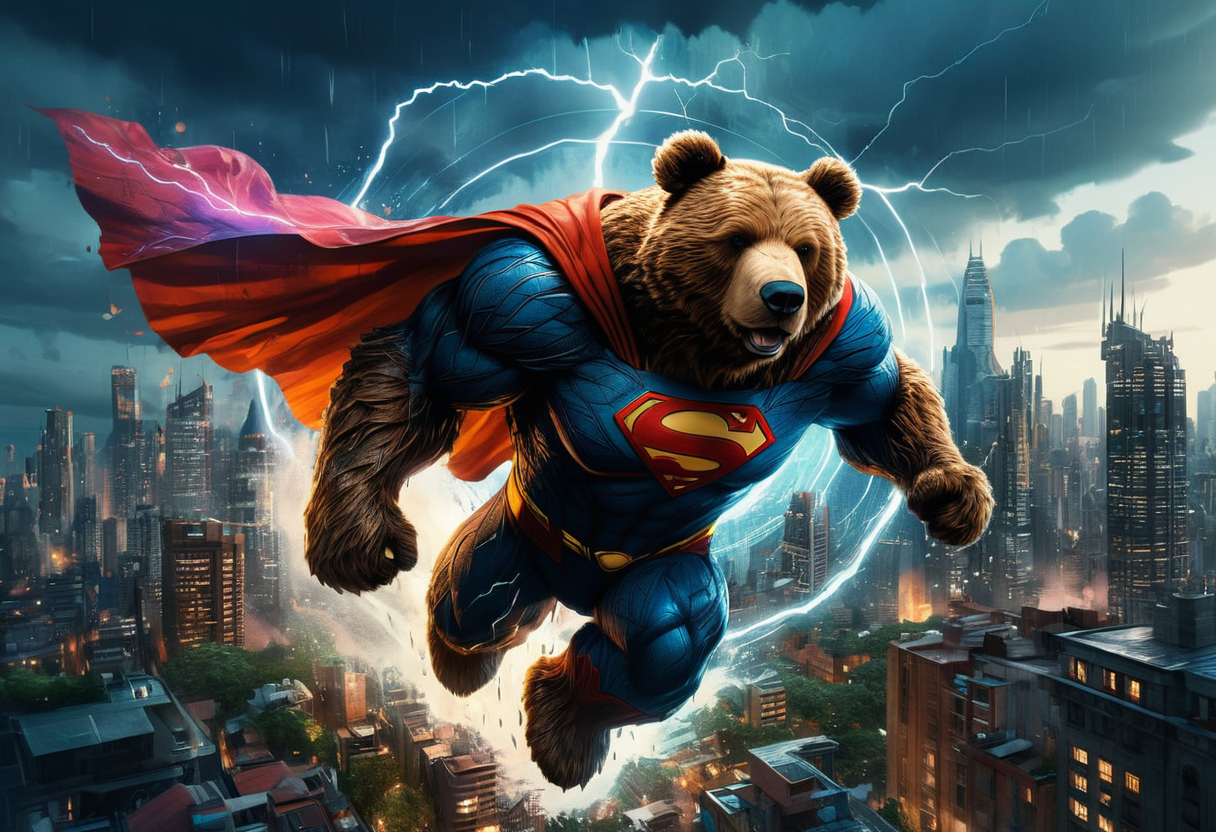 Huge teddybear running towards viewer with superman-cape on steel-beam high above skyscraper city, lightning, Digital watercolor Illustration of a thunderstorm, by Waterhouse, Carne Griffiths, Minjae Lee, Ana Paula Hoppe, Stylized watercolor art, Intricate, Complex contrast, HDR, Sharp, soft Cinematic Volumetric lighting, flowery pastel colors, wide long shot, perfect masterpiecedetailed matte painting, deep color, fantastical, intricate detail, splash screen, complementary colors, fantasy concept art, 8k resolution trending on Artstation Unreal Engine 5, SoraSleepAI, Circle