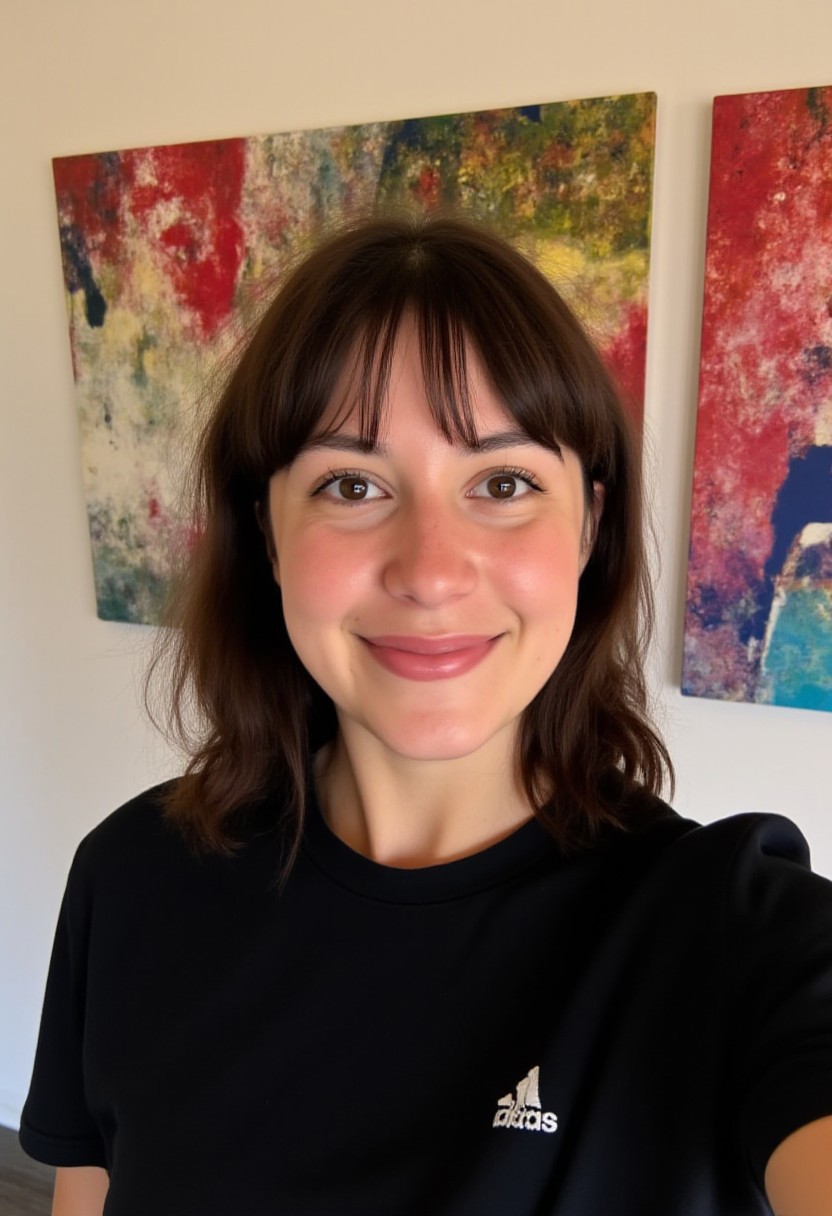 A casual selfie photo taken indoors featuring a young woman standing in front of colorful artwork, with natural daylight softly illuminating her face, and a warm, inviting color palette. The woman has light skin with visible natural textures like pores and a few light freckles. She has a medium build with shoulder-length, slightly wavy dark brown hair styled in loose layers with bangs. Her expression is friendly, with a subtle smile and bright eyes gazing directly into the camera, creating a relaxed and engaging atmosphere. She wears a black Adidas t-shirt with a prominent white logo, and the soft natural light creates a gentle glow on her face, enhancing her facial features without harsh shadows. The background showcases several vibrant, abstract paintings hung on a white wall, adding splashes of color that contrast with her dark outfit. The artwork features a variety of patterns and colors, including reds, blues, and yellows, contributing to an artistic and creative vibe. The overall composition captures the casual and personal nature of the selfie, with the subject standing at arm's length from the camera, centered within the frame, and sharp details throughout, emphasizing both her expression and the lively setting behind her <lora:amateurphoto-v5-14-15-1-1:0.4>