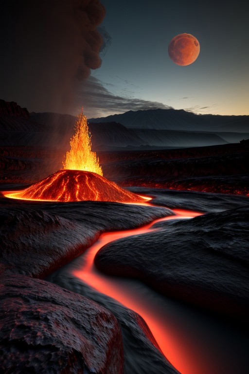 a volcanic eruption, a river of fiery red lava, a waterfall, a large red moon in the background, dramatic lighting, cinematic composition, photorealistic, (best quality,4k,8k,highres,masterpiece:1.2),ultra-detailed,(realistic,photorealistic,photo-realistic:1.37),dramatic lighting,dramatic sky,dynamic composition,volumetric lighting,intricate details,vivid colors,3d render,concept art