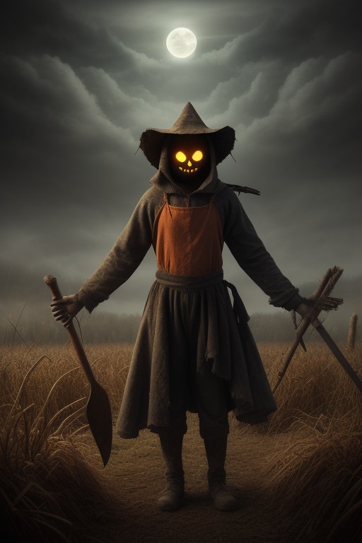 Dark Fantasy Art, Dark Moody Atmosphere, A menacing pumpkin-headed scarecrow looms in a moonlit cornfield, wielding a rusted pitchfork. Eerie orange light flickers within its carved grimace. Tattered robes billow in the autumn wind. Mystical runes glow on its straw-stuffed body, evoking ancient harvest rituals., dramatic, mysterious, dark moody atmosphere, dark, moody, dark fantasy style
