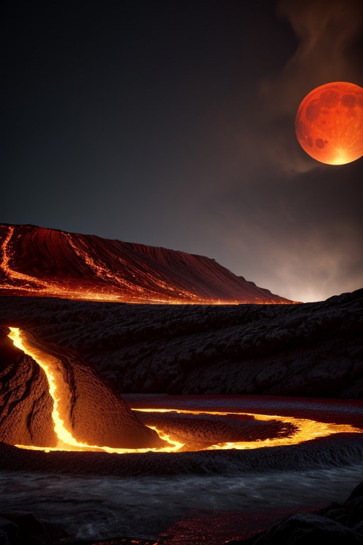 a volcanic eruption, a river of fiery red lava, a waterfall, a large red moon in the background, dramatic lighting, cinematic composition, photorealistic, (best quality,4k,8k,highres,masterpiece:1.2),ultra-detailed,(realistic,photorealistic,photo-realistic:1.37),dramatic lighting,dramatic sky,dynamic composition,volumetric lighting,intricate details,vivid colors,3d render,concept art