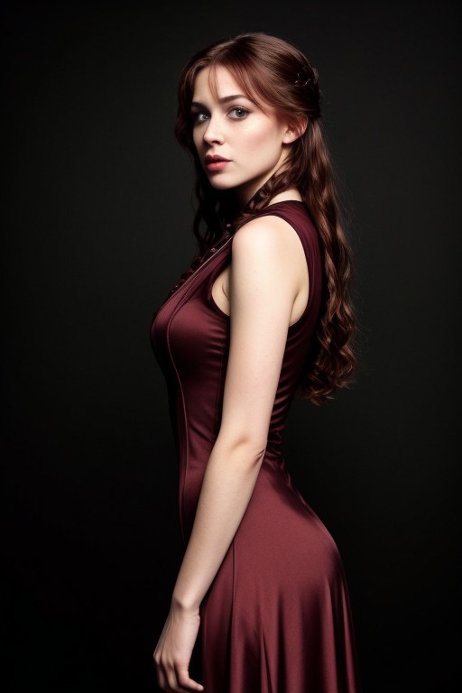 ((pitch black background)), photorealistic, perfect face, beautiful 35 year old sporty woman with curly red hair as a long braid, very elegant victorian evening gown, lost in dark romantic dreams, cute pouting, emo style, very strong eyeliner, slightly from the side