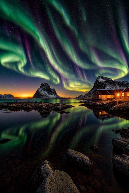 Stunning Aurora Borealis over Lofoten Islands coastline, vibrant colors, dramatic sky, high detail, landscape photography, breathtaking scenery, cinematic lighting, hyper-realistic, 8k resolution, beautiful reflection on water, nature photography, by Ansel Adams and Art Wolfe