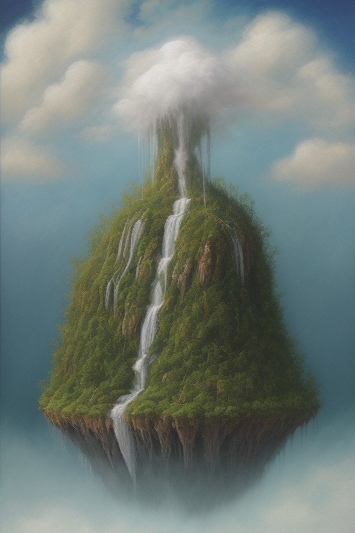 Ghiblistyle fantasy oil painting of a lush alien world, there is a large island floating in the sky. There is a majestic waterfall coming from the floating island