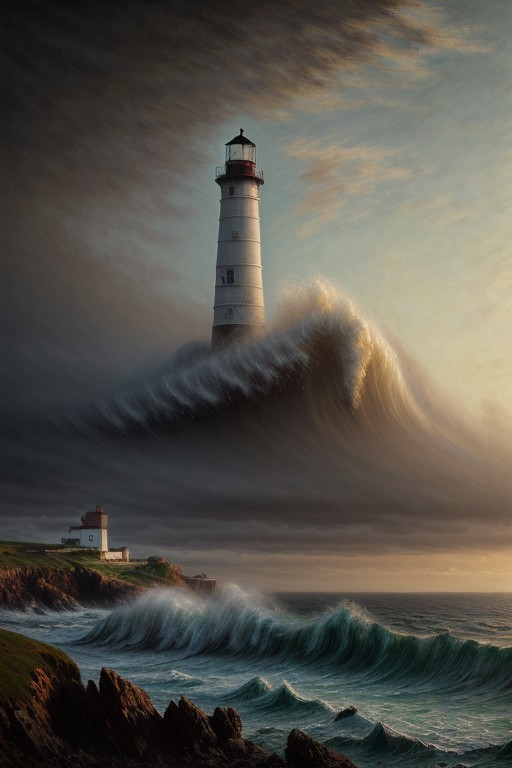 An old lighthouse on a rugged coastline, waves crashing at its base, dramatic sky, high detail, realistic, atmospheric perspective, cinematic lighting, masterful landscape painting, soft waves, highly detailed, 8k resolution, by Ivan Aivazovsky and Claude Monet