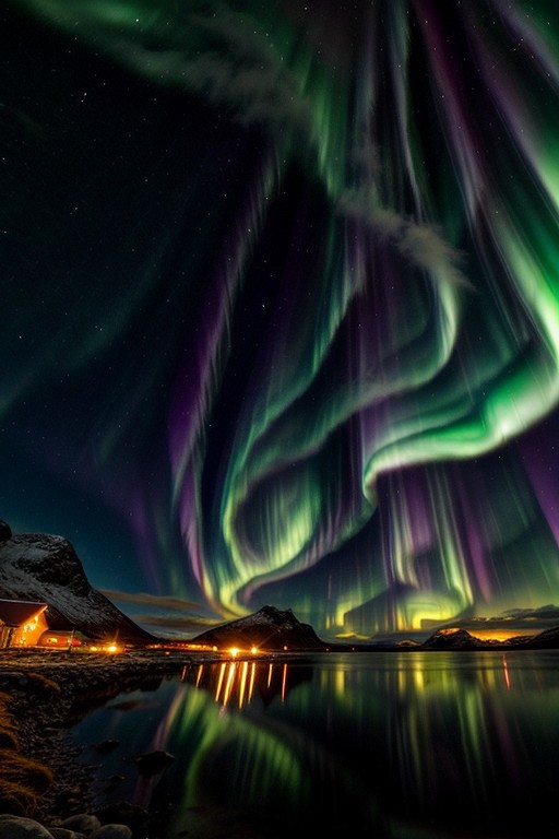 Stunning Aurora Borealis over Lofoten Islands coastline, vibrant colors, dramatic sky, high detail, landscape photography, breathtaking scenery, cinematic lighting, hyper-realistic, 8k resolution, beautiful reflection on water, nature photography, by Ansel Adams and Art Wolfe