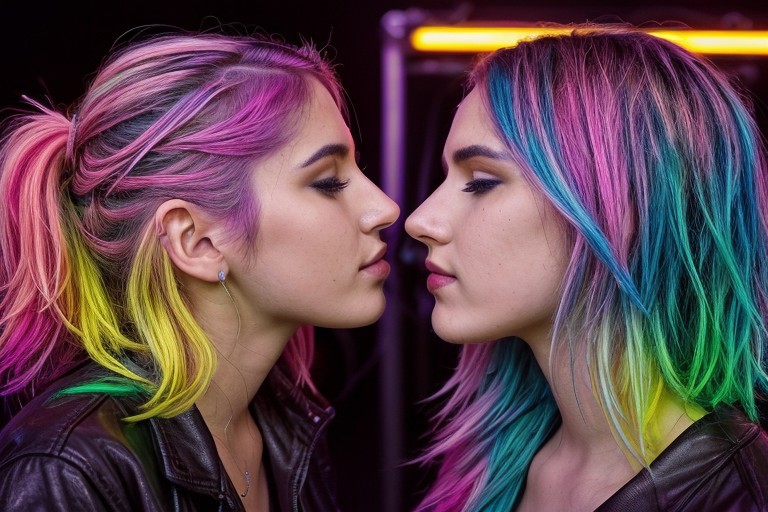 score_9, score_8_up, score_7_up, score_6_up, two beautiful 19 year old girls, colored hair, neon lights, rave, rave clothing, crowd, nighttime, dusk, smiling, ultra realistic, big lips, (masterpiece, best quality, highres:1.2), (photorealistic:1.2), yuri, kiss
